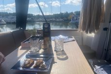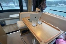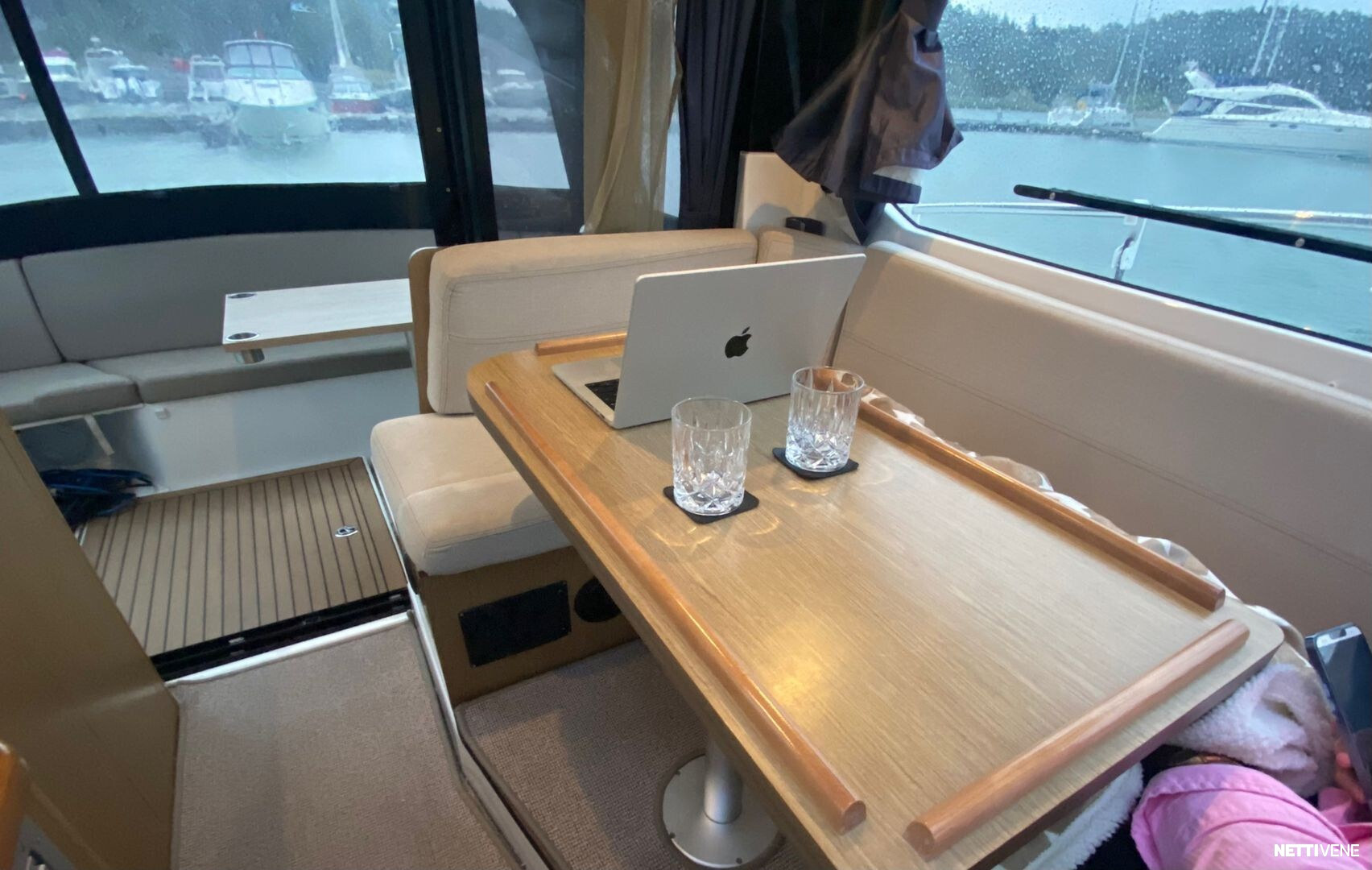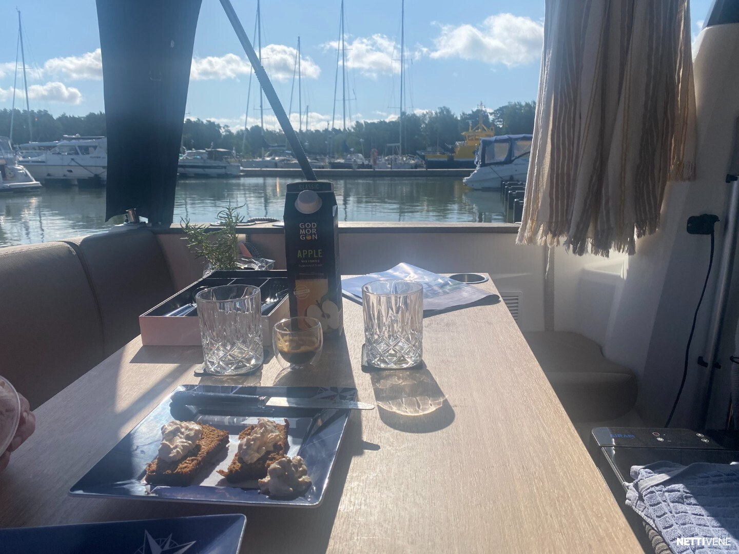 Valoisa ja lämmin salonki, jossa on erinomaisesti säilytystilat. Veneessä on kaksi erillissä pöytäryhmää / istuinaluetta (salongissa ja avotilassa), joissa voi nauttia ja ruokailla ja sään mukaan.