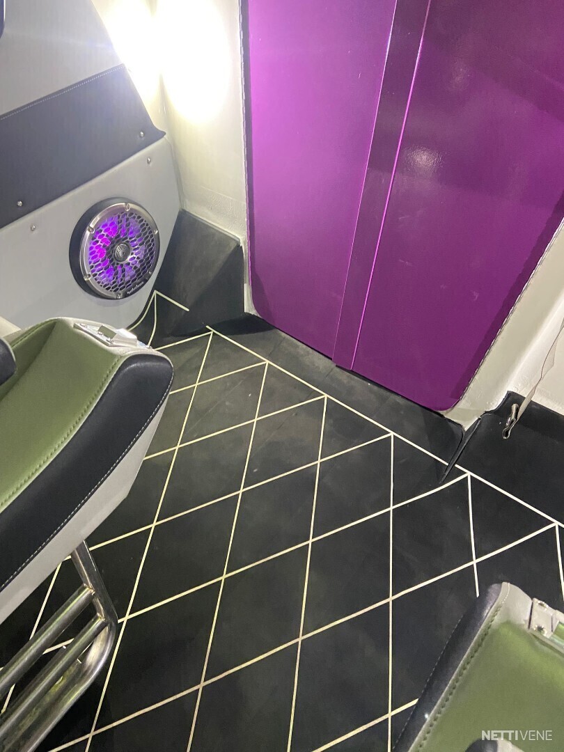 Sisätiloista poistettu wc, jonka tilalle asennettu jääkaappi, sekä laaja äänentoisto laitteisto.
