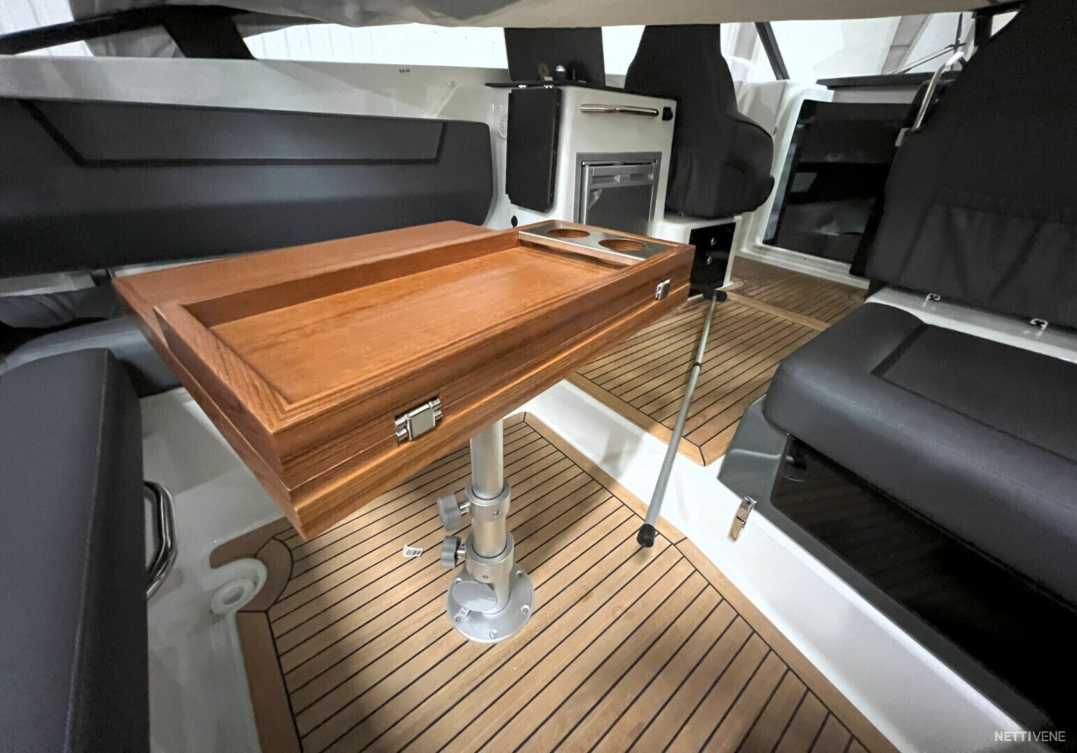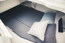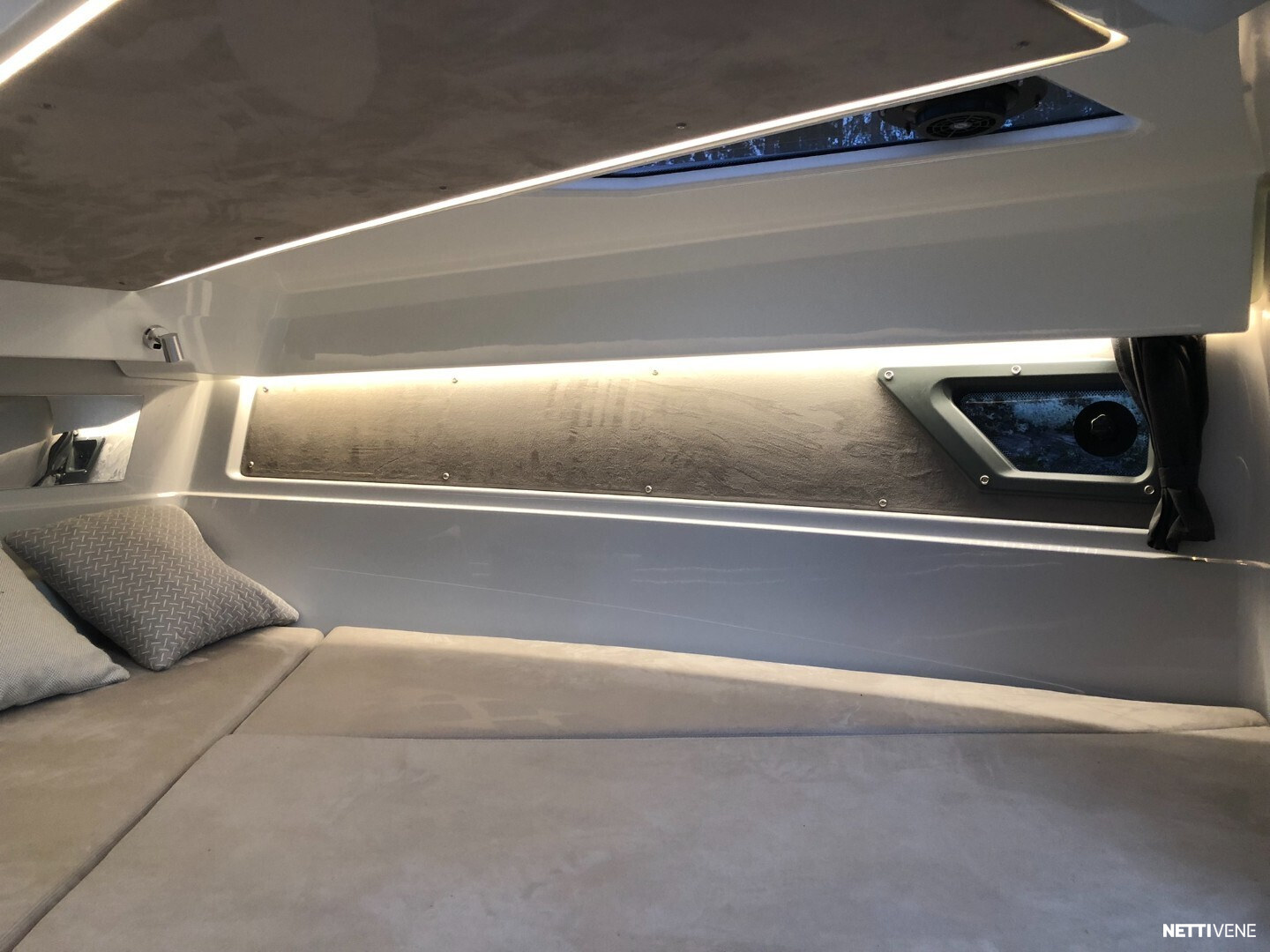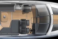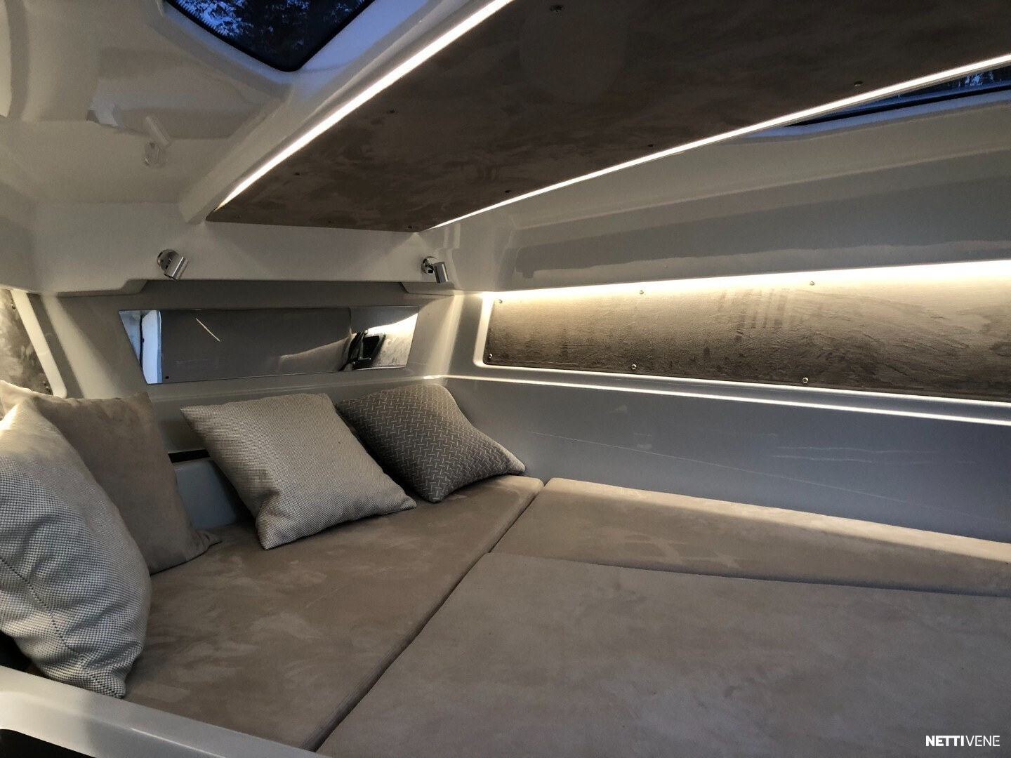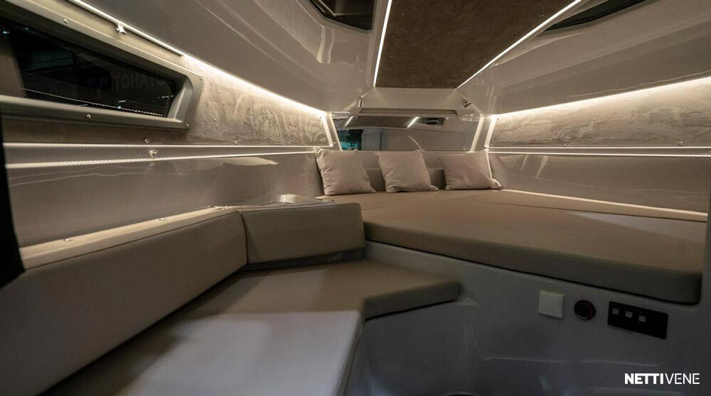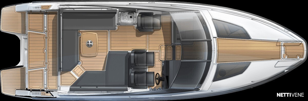 Hulppean kokoinen avotila. Majoitustiloina 2 erillistä kajuuttaa. Veneestä löytyy myös erillinen WC.